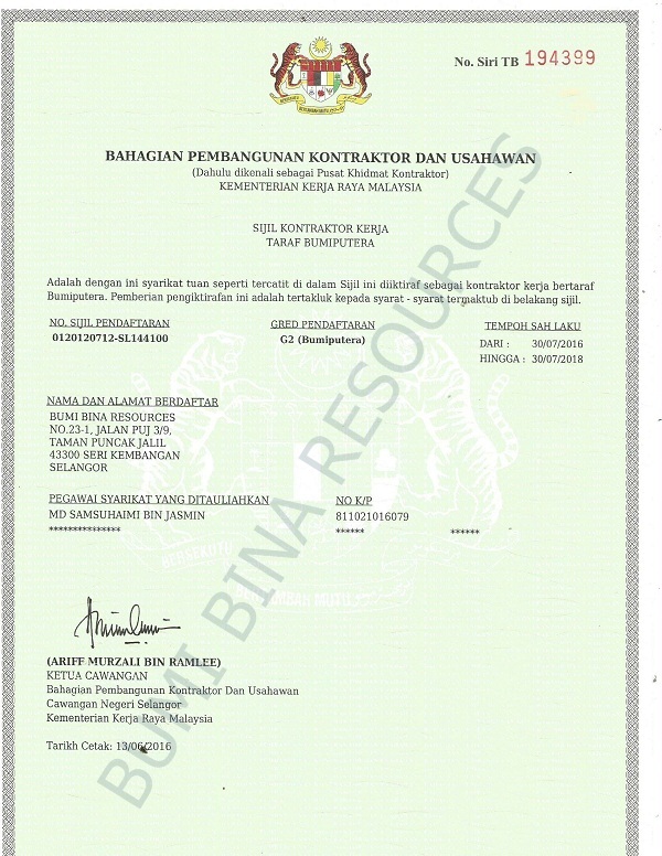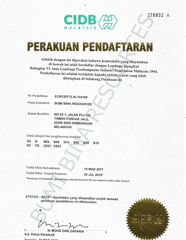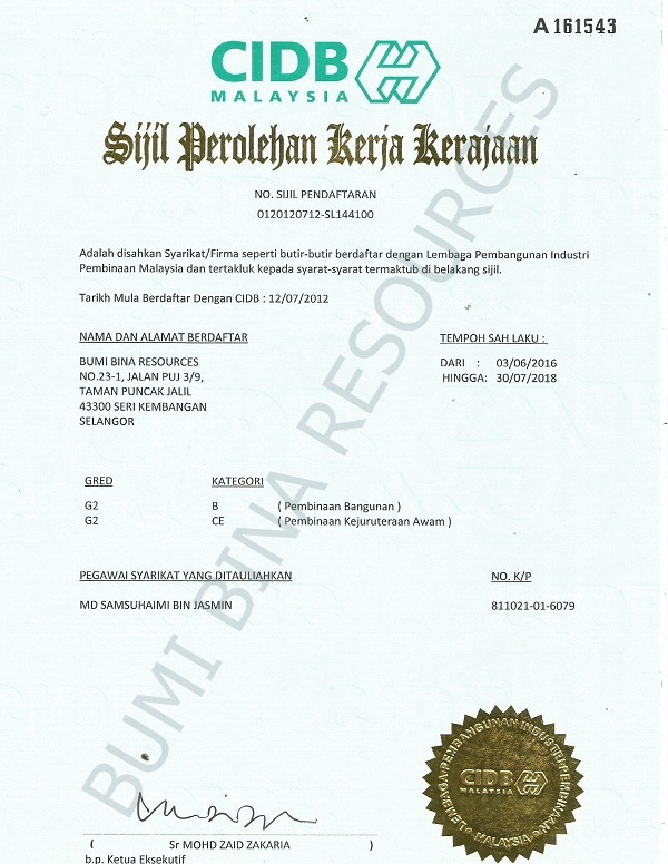 No. Pendaftaran CIDB : 0120120712-SL144100